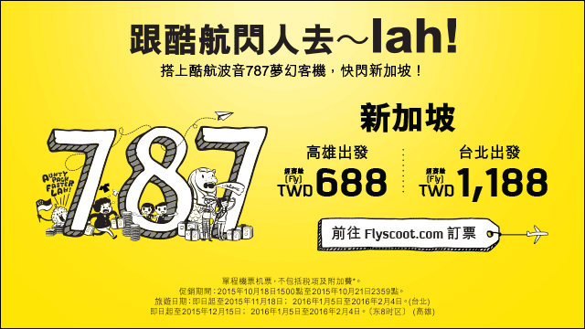 scoot 酷航來自新加坡的廉價航空,限時四天開放台灣-新加坡特價機票,服務班機…