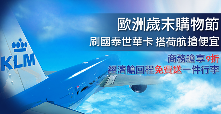 荷蘭航空刷國泰卡購票商務艙9折 經濟艙回程送行李 11/15~1/31/2016…