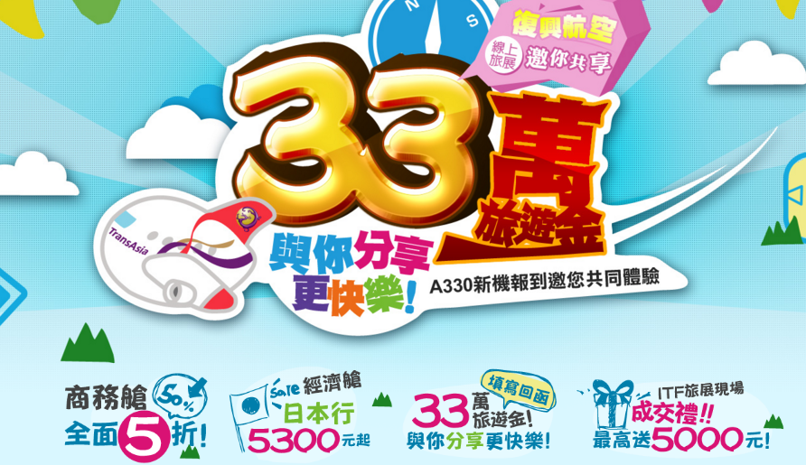 復興航空線上旅展搶先開跑。活動日期11/1~11/15,同時為了迎接A330新班…