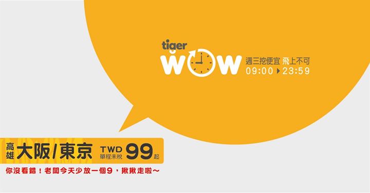 TIGER WOW週三挖便宜 虎航9/9限定 高雄-東京只要99起 高 雄– …