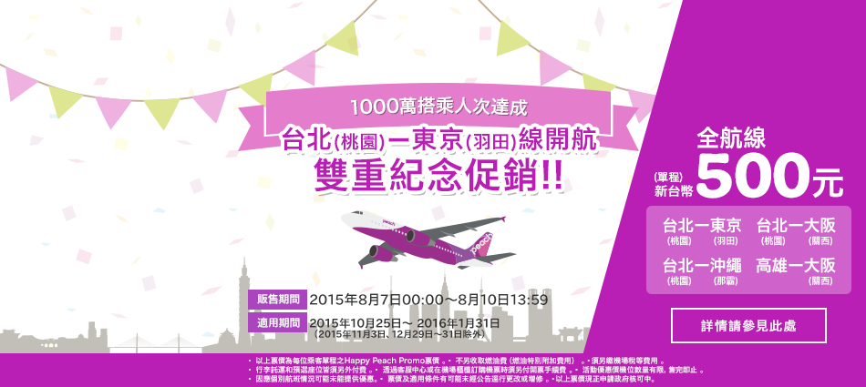 1000萬搭乘人次達成&台北(桃園)─東京(羽田)線開航雙重紀念促銷!! 東京羽…