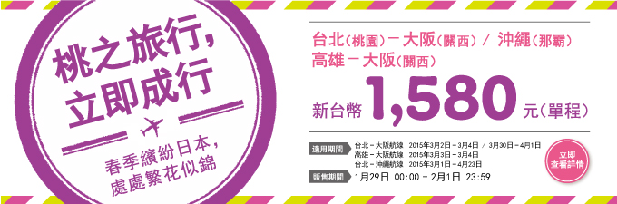 ☆☆ 促銷專案:台北/高雄-大阪、台北-沖繩,單程1,680元 【國際航線販售期…