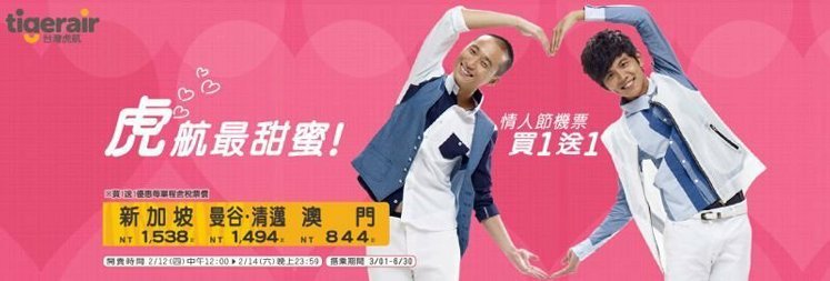 西洋情人節,台灣虎航宣布,12/12 中午12時起推出限時買一送一甜蜜優惠,桃園…