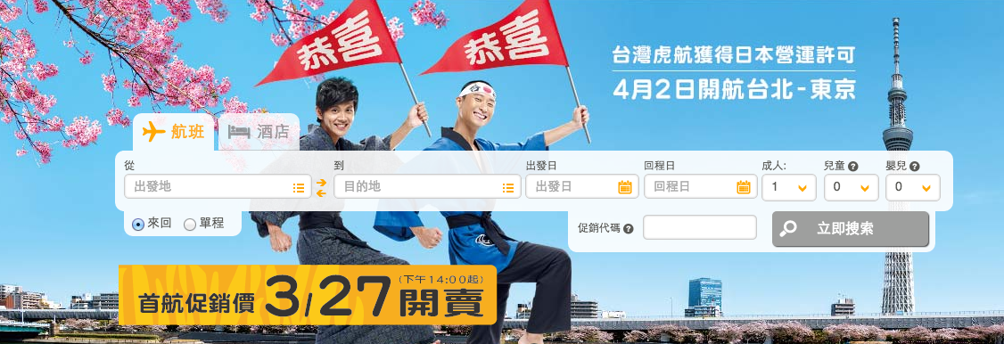 台灣虎航確定「台北(桃園)-東京(成田)」航線即將於4月初開跑,機票預計3月中以…