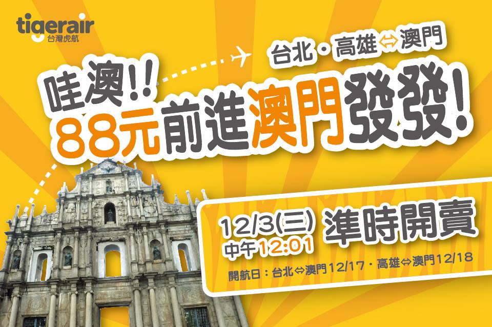 台灣虎航繼新加坡、曼谷及清邁後,12月17日起將新闢澳門航線,桃園、高雄均可出發…